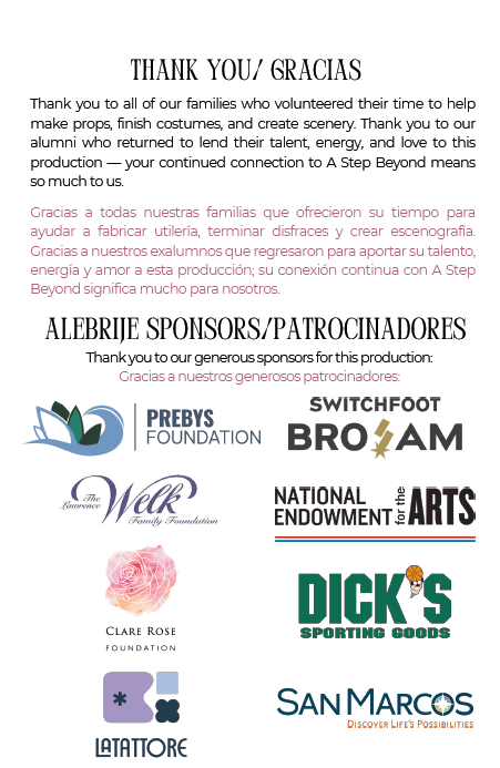 We’ve partnered with Bocón, a youth theater company, to create a culturally resonant script, and with the San Diego Guild of Puppetry to build a stunning large-scale puppet. The performance also features music by Mariachi Champaña Nevin, with choreography, costumes, and props by A Step Beyond’s talented staff, students, and volunteers.